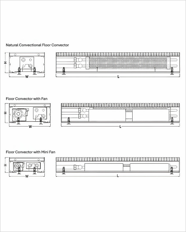 This is an ideal product where aesthetic and mechanical solutions meet to complement the floor heating systems installed on facades consisting of large glass surfaces in order to prevent heat transfer and fogging. Our floor convectors are produced with casing heights of 85 mms and 115 mms up to 6 metres in length. In response to architectural and aesthetic requirements, we can produce the grilles of the floor convectors in 3 types, anodized aluminium, painted aluminium or wood. Their digital control panel with lights and fully compatible flow control valve, enable energy savings by optimizing capacity. The fan can also be worked in 3 stages in automatic or manual mode.
