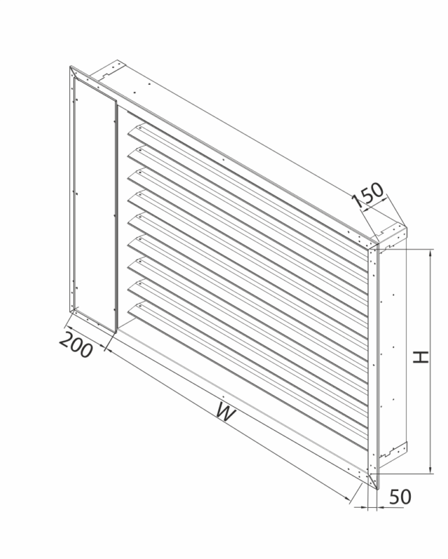 1.5 mms galvanized external casing, blades from aluminium profile or galvanized sheet metal, mechanism and shaft from steel, blade channels from brass parallel blades have mechanism, suitable for motor control, with 20*20 wire mesh.